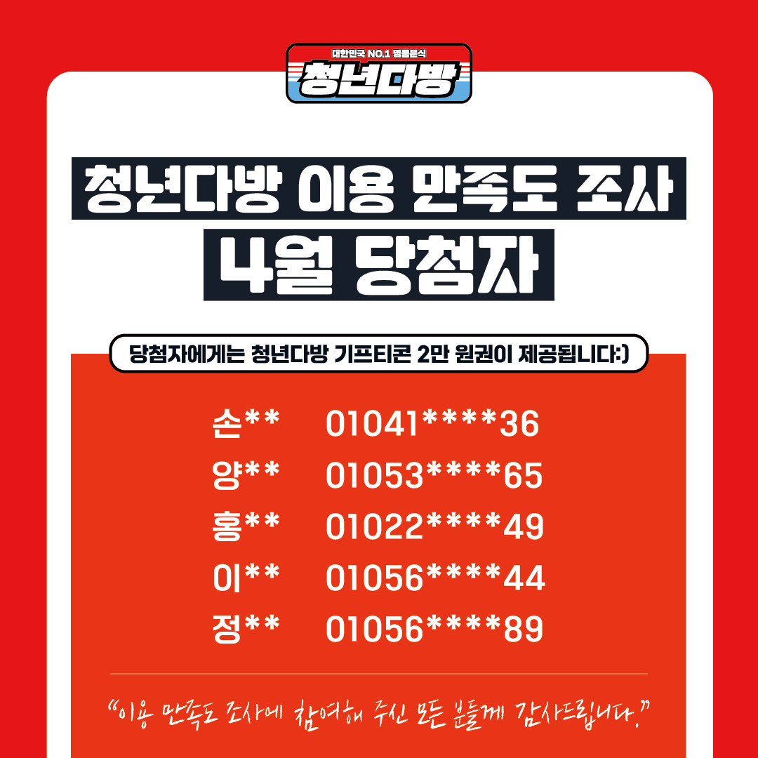 청년다방 만족도 조사 이벤트 4월 당첨자 발표