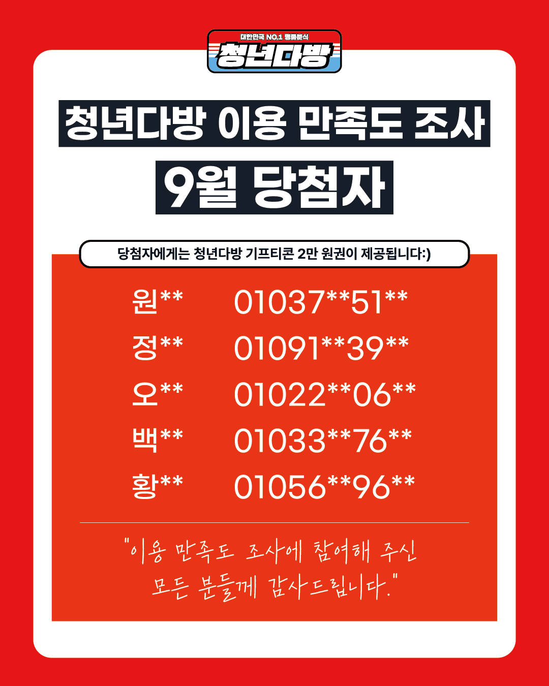 청년다방 이용 만족도 조사 8월 당첨자를 발표합니다!