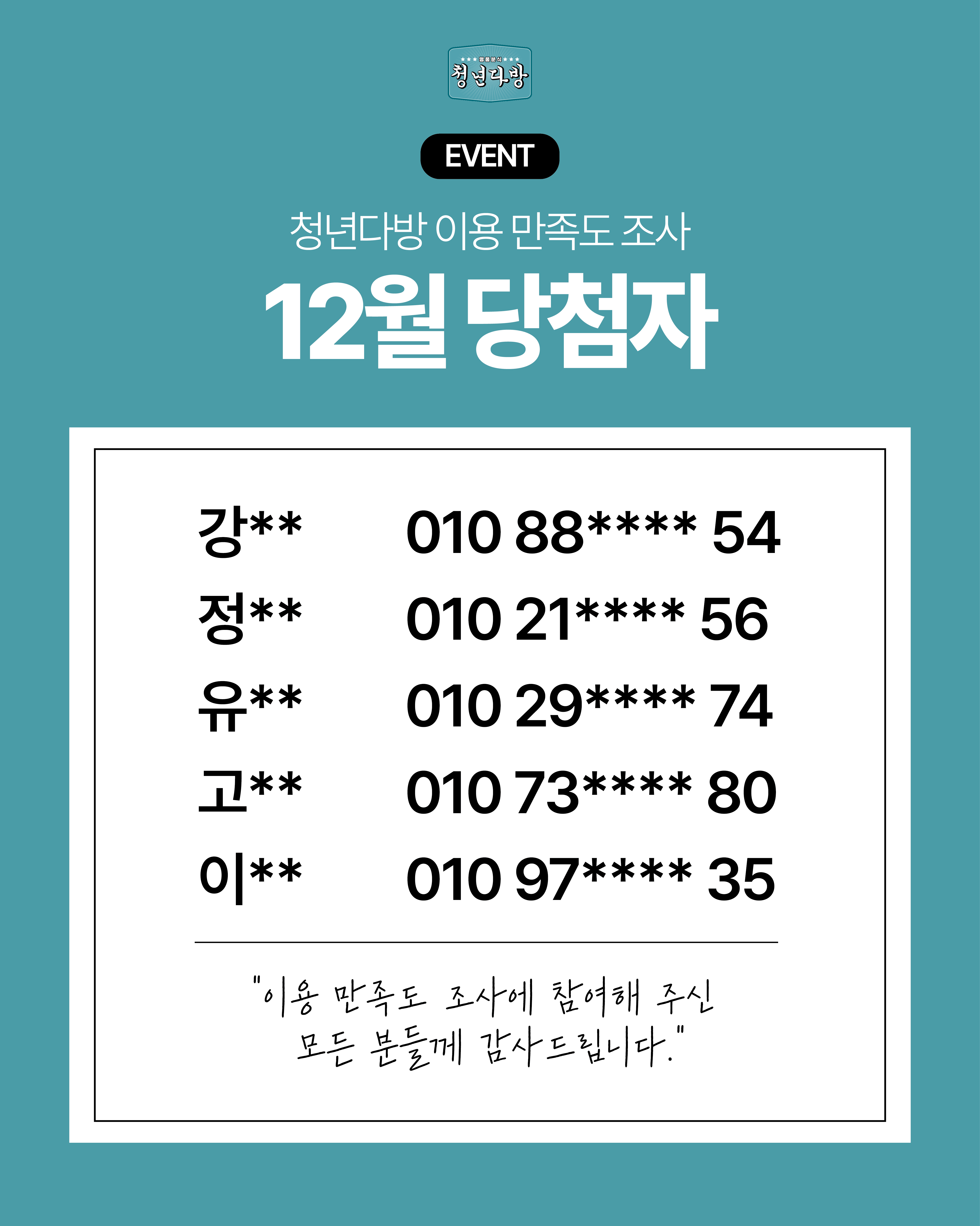 청년다방 만족도 조사 이벤트 12월 당첨자 발표